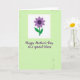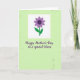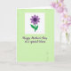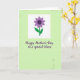 This card features a tall layout with a bright white square near the top, framing a single stylized flower that feels like a small, sweet offering ❤️. The bloom has eight rounded petals in soft lavender surrounding a deeper plum center, like a gentle blush at its heart. A simple green stem drops downward with two small leaves, giving the flower a calm, steady posture that suggests quiet affection. The background is a pale pistachio green wash that sets a soft, springlike scene and makes the central flower feel cared for and noticed. Below the white square, a flowing greeting line sits centered in a rich purple, standing out clearly against the light green field. The spacing leaves plenty of breathing room, so the flower and the message feel close together, like a note passed between friends 🌼. Across the green background, tiny earthy speckles are scattered lightly, adding a natural paper-like texture around the edges and behind the text.
