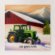 A farmer's favorite green tractor is parked in front of a red barn in the snow.