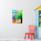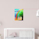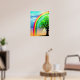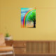 Poster in in a green, watercolor tree, against a blue sky and a vividly colored rainbow