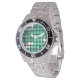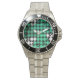 This men's watch has a mid-century modern design of solid black diamonds inside black diamond outlines with triangles in shades of seafoam green under them, all on a field of white.
