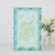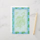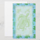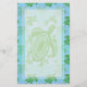 Green sea turtle in cutout style against checkered blue background. Unlined stationery.