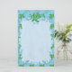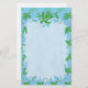 Green sea turtle in cutout style against checkered blue background. Blank stationery paper with a stylized flame border.