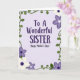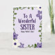 This card features a soft lavender background with the message “To A Wonderful SISTER” centered in deep plum lettering, followed by “Happy Mother’s Day!” just beneath it in a lighter purple, flowing handwritten style. The main line uses a sturdy, classic type style that feels steady and caring, while the second line looks more like a gentle note shared between close family ❤️. Around the edges, curling green vines form a loose frame, giving the layout a tender, growing-garden feel. Small five-petaled flowers sit along the vines and in the corners, as if tucked there with quiet affection. The blossoms alternate between creamy white and light amethyst, suggesting a sweet back-and-forth like friendly conversation 🌼. Each flower has a tight cluster of darker purple dots at its center, adding a delicate focal point without crowding the design. The border stays thin and airy, with the green tendrils and scattered flowers wrapping all four sides of the card.