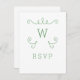 Modern and simple Whimsical Flourish Monogram Wedding Response Postcard featuring an elegant swirl motif in green. Easy to customize, simply add your initial and wedding details in the text fields provided. Click "Customize It" to find more personalization options.