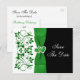 This romantic black and white and emerald green floral wedding save the date post card has a PRINTED ribbon and bow with a pair of PRINTED diamond jewels and FAUX glitter joined hearts on it that matches the St. Patrick's Day wedding invitation shown below. ****PLEASE NOTE there is no embossing or raised images on this card. ALSO, Zazzle will NOT edit anything for typos or alignment or spacing, so please make sure your text is exactly how you want it. I will not see your card, so if you need help with the customization of my design, please email me BEFORE you order. Everything is printed flat. The text is fully customizable. If you require any matching items, please email your request to niteowlstudio@gmail.com.