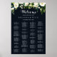 This green white floral blue alphabetical seating chart is perfect for a rustic wedding. The design features elegant watercolor white peonies with green foliage in a dark blue background.