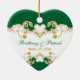 This personalized heart shaped ceramic Christmas ornament in forest green, white, and gold scrolls has a faux embossed green damask pattern background, with a faux gold glitter (PRINTED) ornate floral scrolls with decorative gold shamrocks on it that match the Irish, Celtic, or St. Patrick's Day wedding invitation shown below. It would make a lovely collectible ornament for the newlyweds, or for anyone of Irish heritage. The text is all customizable. ***PLEASE NOTE that if you change the font or size of the font, it may alter how your ornament prints. It will print the way you see it on your monitor, so if you have alignment issues, or sizing problems, please contact me for help. I will not see your ornament once you order it, and Zazzle will NOT edit anything (typos, alignment, etc.). If you require assistance or would like any other matching items, please email your request to niteowlstudio@gmail.com.