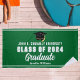 This modern green and white custom senior graduation party beach towel feature classy typography and your college name for the class of 2024 and white Varsity letters. Customize with your graduate name under the chic handwritten script and black grad cap for a great commemorative keepsake gift.