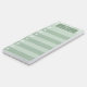 Personalized snowflake checklist notepad with easy to customize script calligraphy name template and list type template. The background stripes alternate between shades of medium and light sage green with white snowflakes serving as checkboxes.