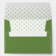 Stylish green wedding envelope, with graphics of a garland of Edelweiss blooms, along the edge of the back flap. Inside is lined in white with green polka dots. Black text, on the back flap, is ready to personalize for your big day. Matching products available.