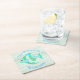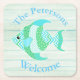 Beach cottage theme pulp board paper coasters, with graphics of a whimsical blue, green and white patterned fish, on a light green wood washed looking background. Personalize the blue arched text to suit your needs. Great for anytime use and makes a nice gift idea.