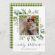 This modern custom text Christmas | holiday photo card features painted watercolor eucalyptus, green leaves and green winter plaid print on the back. Send holiday cheer to your family and friends.
