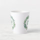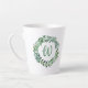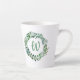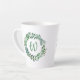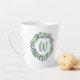 Stylish white latte mug with graphics of a green foliage wreath, on both sides. A green single letter monogram, inside each wreath, is ready to personalize to suit your needs.