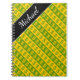 This notebook design features green dollar sign symbols within yellow stripes, and yellow dollar sign ($) symbols within green stripes. It could make a great gift for somebody who works in the finance industry (such as an accountant, or an investor, or in banking), or perhaps for somebody who is into collecting monetary bills and coins. It also features a customized name at an angle.
