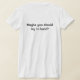 My overall review is that the T-shirt is nice, it fits true to size however the font is significantly smaller than advertised and you can't read it. The printing is unreadable and there is a strain to read it. It does not look like the advertised product. Maybe the shirt color is darker or a larger more visible font should have been used. Photos with and without flash and font is barely legible.