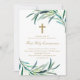 Botanical watercolor eucalyptus leaves with cross, religious First Holy Communion announcement invitation.