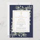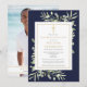 An elegant personalized photo celebration of life remembrance invitation featuring botanical watercolor greenery foliage on a navy blue background. Designed by Thisisnotme©