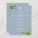 This elegant eucalyptus greenery botanical dusty blue first holy communion save the date invitation postcard can be personalized with your information in chic typography with monogram initials on the reverse. Designed by Thisisnotme©