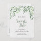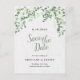 Modern and elegant Save the Date postcard featuring delicate branches and leaves hanging from the top. The soft linen texture background adds a rustic feel. This timeless design is perfect for a wedding during any season of the year.