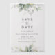 Invite friends and family in style and set the tone for your special day with this charming save the date card. Design features eucalyptus leaves and greenery.