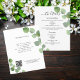 A modern, elegant wedding details/program/timeline. A white background decorated with eucalyptus greenery, sprigs. Personalize and add your names and wedding details. Black colored letters.
