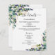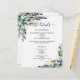 A modern, elegant wedding details/program/timeline. A white background decorated with eucalyptus greenery and golden foliage. Personalize and add your names and wedding details. Black colored letters.