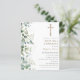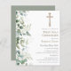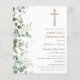 Looking for the perfect way to invite your family and friends to your child's First Holy Communion? Look no further than our customizable First Holy Communion paper invitation! Featuring an ornate gold-tone crucifix and a lush eucalyptus greenery border on a white background, this invitation is sure to impress your guests and set the tone for a beautiful and meaningful celebration.