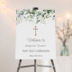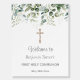 Celebrate your child's First Holy Communion in style with our customizable Welcome Sign! Featuring a gold-colored crucifix and delicate eucalyptus leaves on a pure white background, this foam board sign is the perfect way to welcome your guests to your child's special event.
