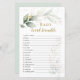 This design features a watercolor illustration of green and gold foliage - Baby Shower Word Scramble Game. On the top of the card - gold effect confetti. Unscramble the baby words. The Answer Key: Baby Powder, Bottle, Blanket, Diapers, Lullaby, Car Seat, Thermometer, Shampoo, Pacifier, Rattle, Bassinet, High Chair, Baby Monitor, Stroller, Nursery