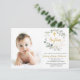 Baby Photo Baptism/Christening Invitation Card. This design features an illustration of green and golden foliage in watercolor style