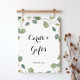 This greenery foliage calligraphy cards and gifts sign is perfect for a rustic wedding or bridal shower. The design features hand-drawn botanical green eucalyptus branches and leaves.