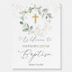 This design features an illustration of green and gold foliage in watercolor style. Above the leaves - confetti adorns the top of the poster (their images can be removed). Inside the greenery wreath there is an image of a Cross.