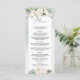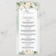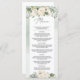 This is bohemian modern wedding menu features greenery foliage and eucalyptus and white roses accented gold sparkles at watercolor background