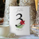 Theme Parties' holiday greenery table numbers design features hand-painted watercolor botanicals and a pretty red poinsettia. The modern simple design is set on a crisp white background and accented with matching gold speckles. #Christmas #Holidays #HolidayParty