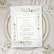 An elegant celebration of life remembrance invitation postcard featuring botanical watercolor greenery foliage on a gray marble background. Designed by Thisisnotme©