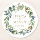 This lovely coaster design features rustic greenery with navy sprigs. Easily edit the names and date!