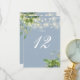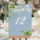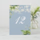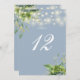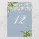 These elegant botanical greenery floral string lights wedding table numbers can be personalized in chic typography on a dusty blue background. The cards are printed on the front and back (double-sided). Designed by Thisisnotme©