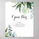 This greenery tropical wedding open bar sign is perfect for a modern wedding. The design features predominantly green tropical leaves.