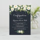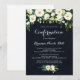 This greenery white floral royal blue confirmation invitation is perfect for a rustic religious event. The design features elegant watercolor white peonies with green foliage in a dark blue background.