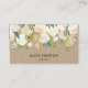 Elegant floral business card with pale watercolor peonies drop with (not real) gold foliage accents and greenery.