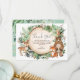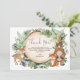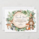 Whimsical thank you card featuring illustration of rustic watercolor greens, foliages and adorable forest animals: fox, bear, deer, raccoon, owl