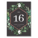 Chic winter botanical table number cards feature a faux copper geometric border surrounded by green watercolor botanical foliage and tiny white flowers, on a rich earth toned background. Designed to coordinate with our Greenhouse wedding stationery collection. NOTE: Table number cards must be customized individually and added to cart one by one.