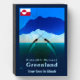 Whales with spears. A traditional travel poster-style image of two male narwhal (Monodon monoceros) "tusking," crossing their tusks, with sea ice and the mainland of Greenland in the background. Text reading "Greenland" and "Kalaallit Nunaat" (Greenland in Greenlandic) also appears. Greenland's flag depicting the setting sun reflecting off the ocean appears at upper left. Customize by adding your own additional text.
