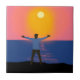 Greeting to the Sun. A man is standing on a beach facing toward the open sea and saluting the yellow sun with raised arms.