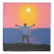 Greeting to the Sun. A man is standing on a beach facing toward the open sea and saluting the yellow sun with raised arms.