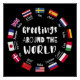Cheerful world travel theme featuring greetings in different languages with country flags. Perfect for travelers, language lovers, and cultural enthusiasts who enjoy international diversity.