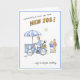 Funny cartoon greeting card with man on icecream bicycle with children and dog..congratulations on your new job.