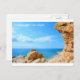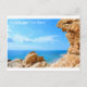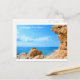 Postacrd with rock, beach and sea and with „Greetings from Costa Brava“ sign.