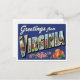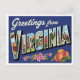 Celebrate the history and beauty of the Old Dominion with this picturesque vintage-style "Greetings from Virginia" postcard! This classic large-letter design features the state name in bold, dimensional script against a deep blue background. Inside the letters, you'll find scenic vignettes of Virginia's rich past, including historic architecture, canals, charming town streets, and perhaps a nod to Williamsburg or Richmond. The card is beautifully accented by pink dogwood flowers (the state flower) and luscious peaches or apples.