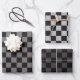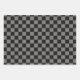 A trio of black and grey wrapping paper sheets. There is a light grey and black checked wrapping paper sheet, a black and grey checkered wrapping paper sheet and a dark grey and black wrapping paper sheet. Please see all photos.